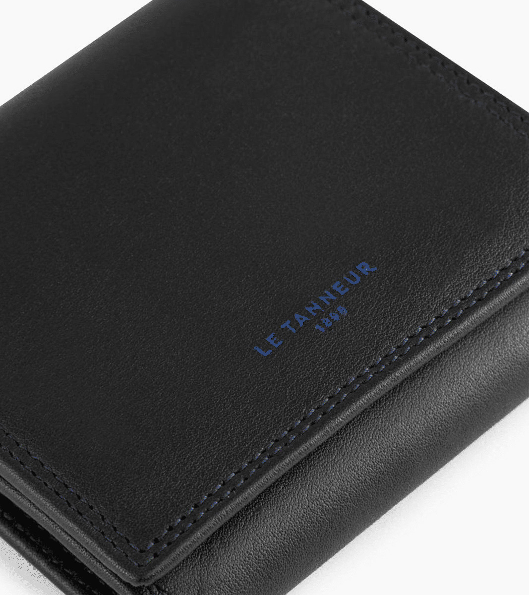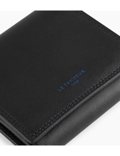 Ce porte-monnaie boîte arbore un discret marquage Le Tanneur couleur Le Bleu, ainsi qu’un double point du même contraste cousu à la main.