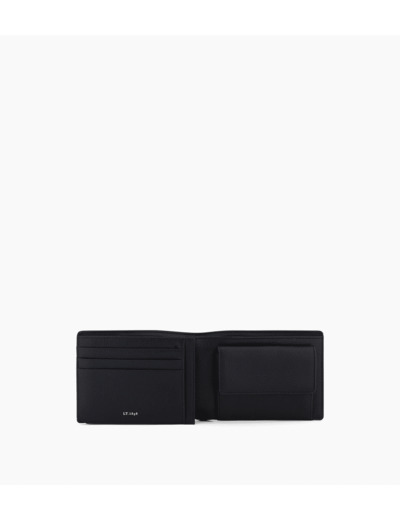 Portefeuille horizontal deux volets en cuir grainé avec poche monnaie rabat. Marquage Le Tanneur sur film argent. Sécurité anti-RFID.