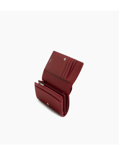 2 poches plates, 1 soufflet, 1 poche billets, 1 poche zippée monnaie et 8 compartiments cartes. 1 poche plate arrière.
