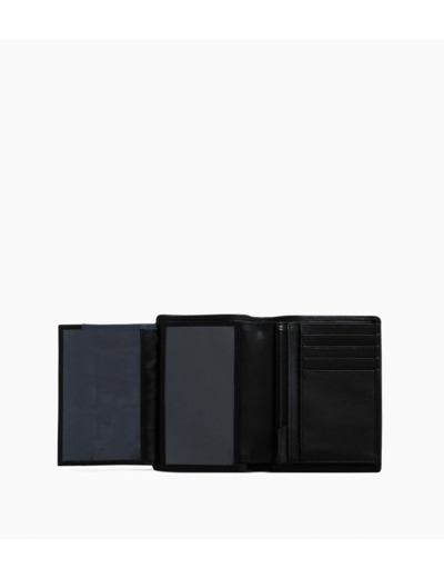 3 poches plates, 2 poches ID, 1 poche monnaie zippée, 1 poche billets et 8 compartiments cartes.