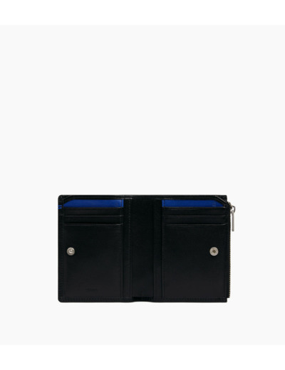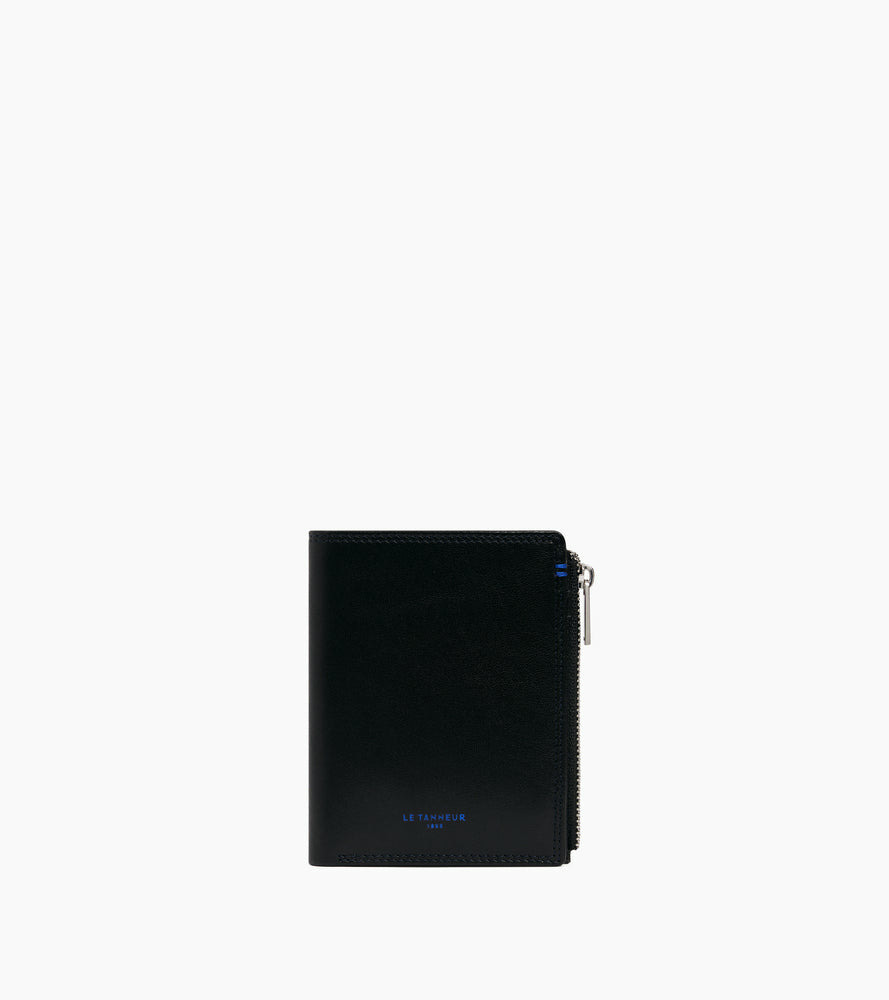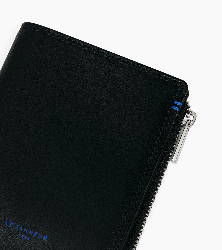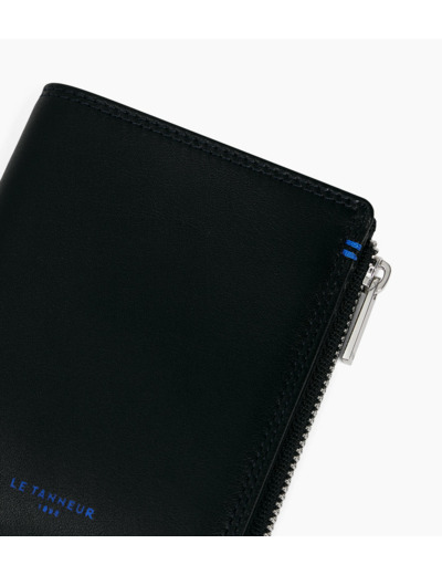 Portefeuille vertical deux volets avec marquage Le Tanneur, fermoir pression et poche monnaie zippée finition argent. Intérieur et points bleu signature. Sécurité anti-RFID.