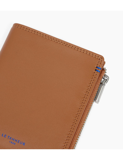 Portefeuille vertical deux volets avec marquage Le Tanneur, fermoir pression et poche monnaie zippée finition argent. Intérieur et points bleu signature. Sécurité anti-RFID.