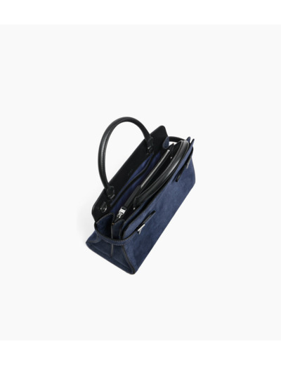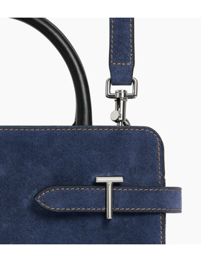 Sac à main en cuir suède effet denim. Sac moyen format avec bijouterie T signature finition argent et marquage Le Tanneur ton sur ton. Porté main, épaule ou croisé grâce à sa bandoulière ajustable et amovible.
