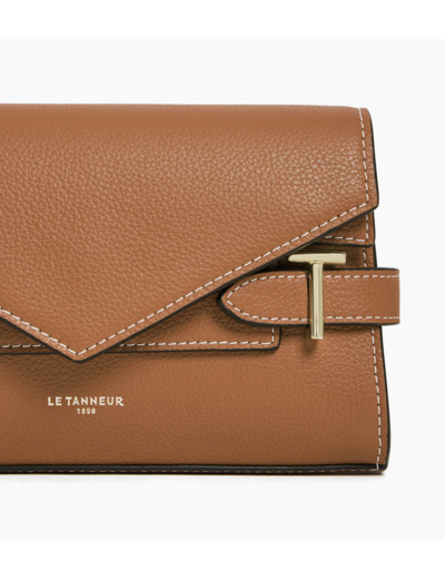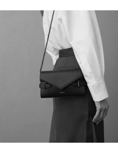 Pochette double rabat marquée Le Tanneur, avec bandoulière chaine et bijouterie T signature. Porté épaule ou croisé.