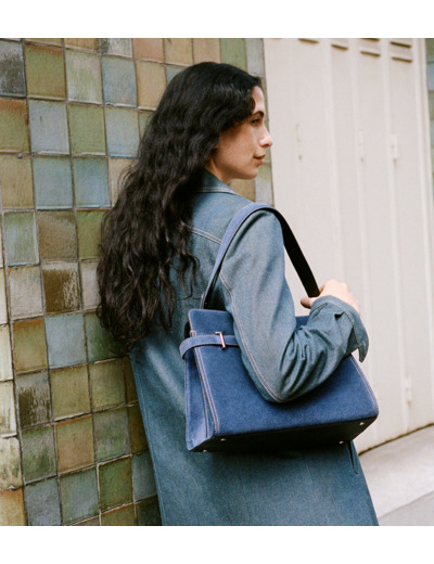 Cuir de veau refente de cuir suède effet denim. Doublure textile Le Bleu.
