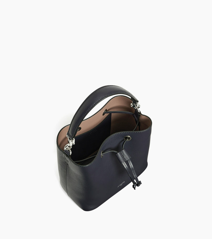 Sac seau avec ornement en cuir et marquage Le Tanneur. Porté main, épaule ou croisé grâce à sa bandoulière ajustable et amovible.