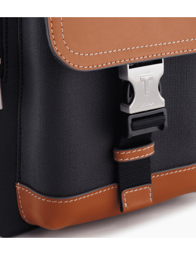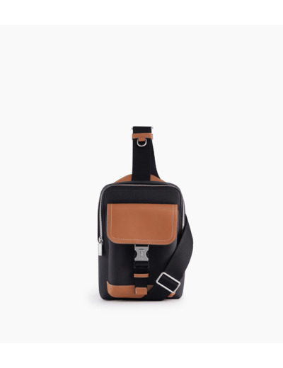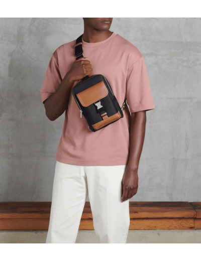 Sacoche sling bi-matière avec fermoir T signature finition argent brossé et marquage Le Tanneur ton sur ton. Porté épaule ou croisé grâce à sa bandoulière ajustable.