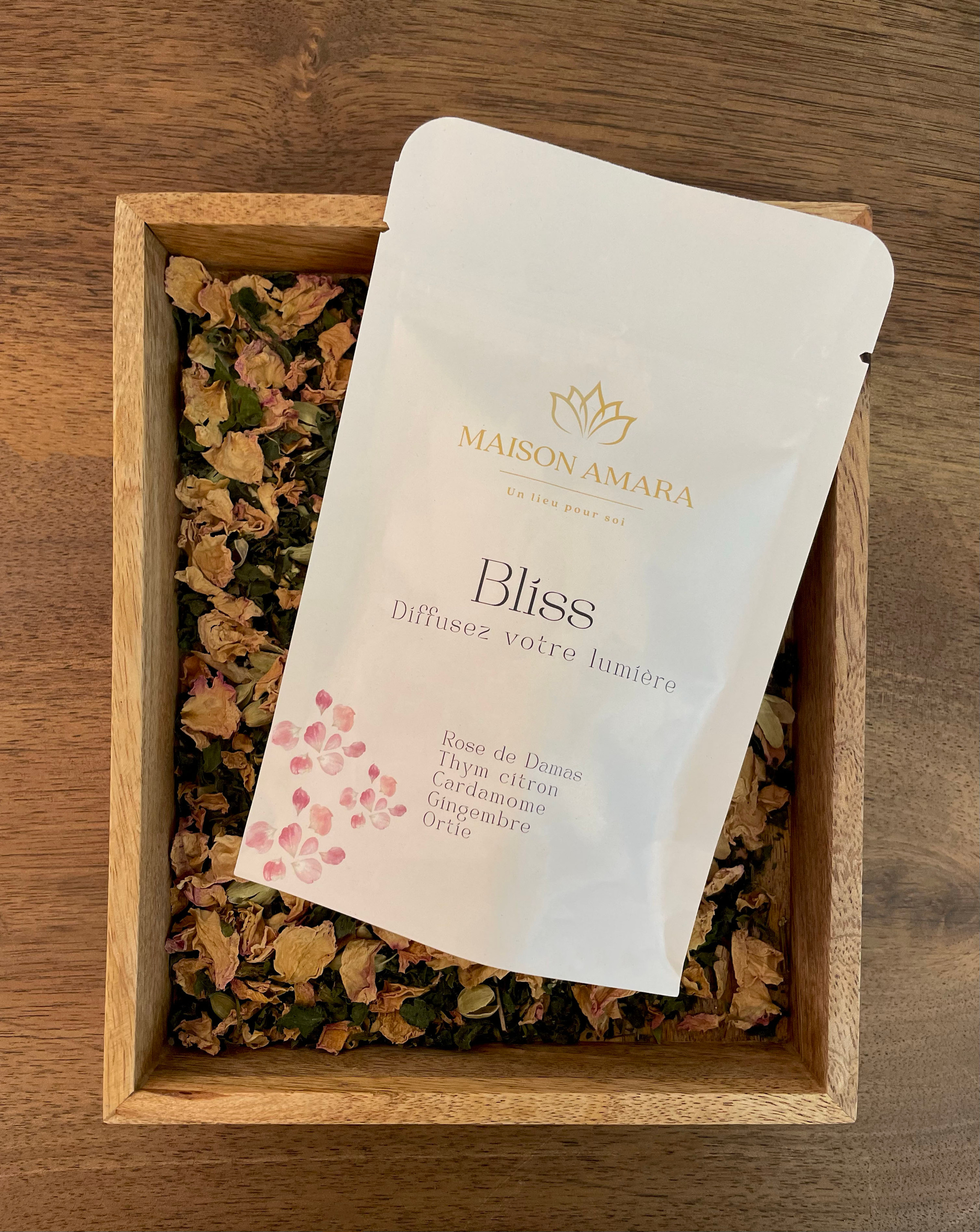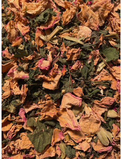 Cette tisane signature de Maison Amara a été conçue pour vous accompagner dans un moment de bien-être et d’harmonie. Un mélange délicat de rose de damas, d’ortie, de thym citron, de gingembre et de cardamome, chaque gorgée apporte à la fois apaisement et vitalité. Ce mariage unique équilibre le corps et l’esprit, favorisant l’harmonie intérieure et l’apaisement émotionnel. La majorité des ingrédients proviennent d’une herboriste locale qui cultive ses plantes avec soin et amour, dans de la plaine de Versailles. Prenez une pause, respirez profondément, et rayonnez.