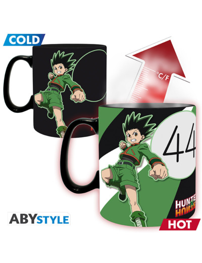 Le combat entre Gon et Hisoka à la Tour Céleste marque un tournant dans le développement du personnage de Gon. Ils échangent de nombreux coups explosifs, et Gon peut enfin rendre à Hisoka le badge qu'il a obtenu à l'examen Hunter. Vous les trouverez tous les deux sur ce mug thermo-réactif Hunter X Hunter