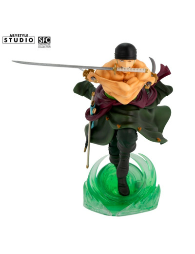 Faites de la place pour accueillir Zoro, l'intrépide et non moins redoutable épéiste de l'équipage du Chapeau de paille ! Avec sa détermination à toute épreuve et ses talents de sabreur inégalés, le Chasseur de Pirates va se tailler une place de choix dans la gamme SFC d'ABYstyle Studio... si pour une fois il ne se perd pas en chemin ! Quoi qu'il en soit, préparez-vous à être impressionné par sa maitrise du Santôryû, utilisant ses trois sabres Wado Ichimonji, Sandai Kitetsu et Shusui pour venir à bout de tous ses ennemis croisés sur son chemin !
