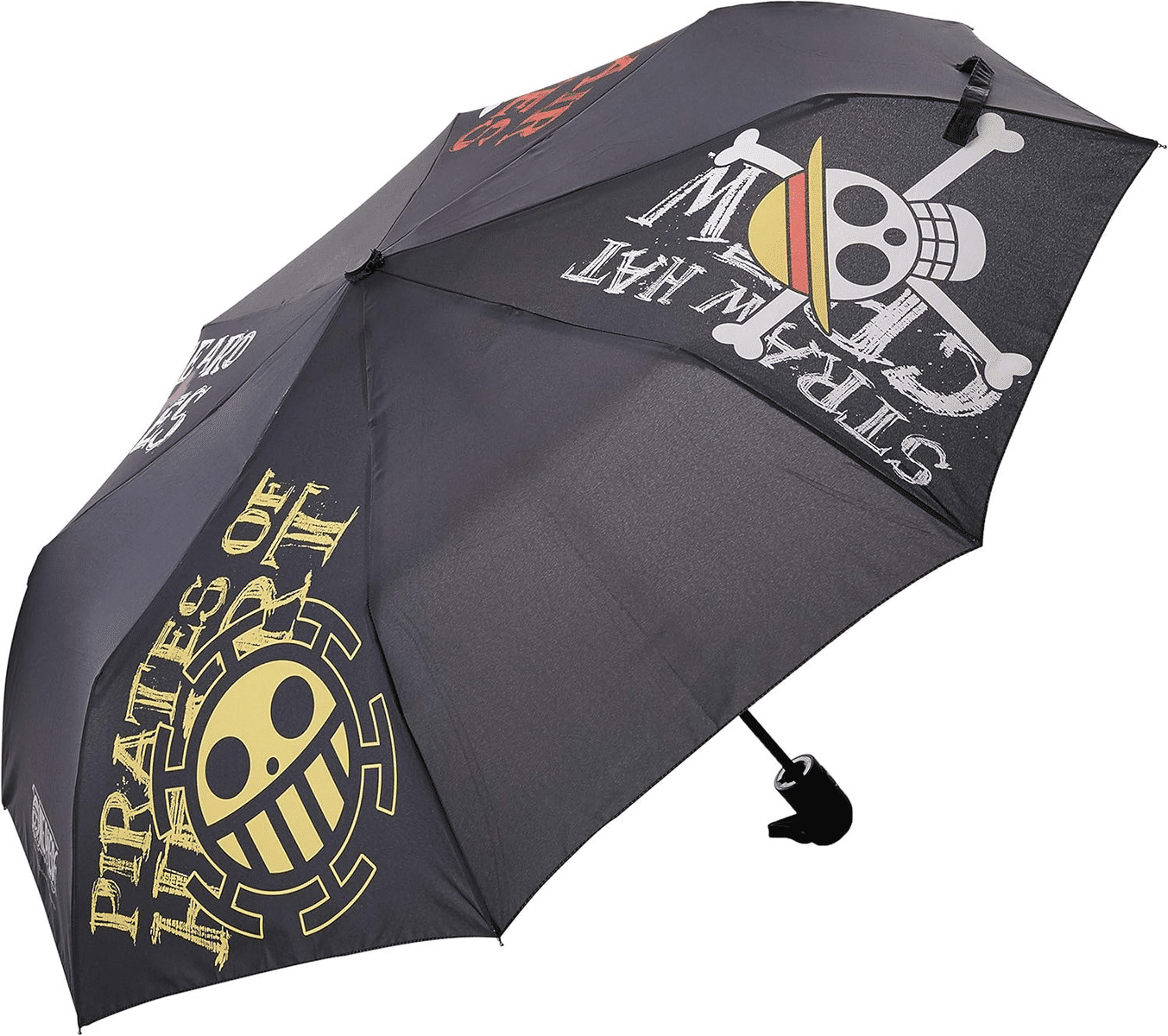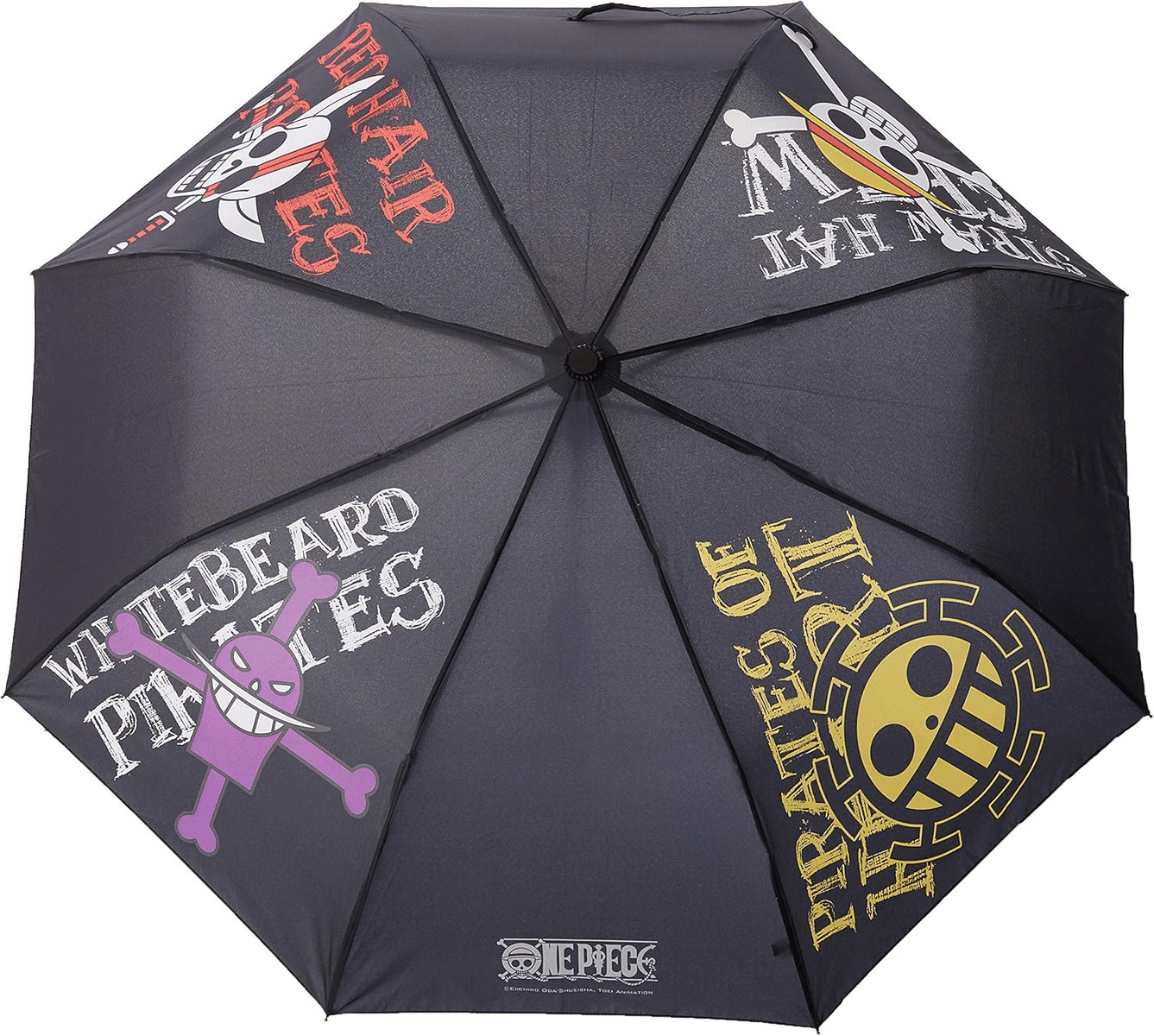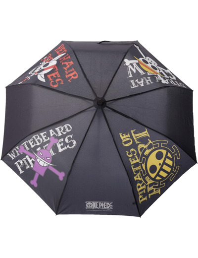 Pour vos longs voyages de pirates en mer par temps pluvieux, ABYstyle a pensé à vous et vous propose ce parapluie One Piece représentant les emblèmes de différents équipages emblématiques de la série. @@- Matière : 100% polyester @- Emballage brochable, adapté à la mise en rayon @- Dimensions : environ 96 cm de diamètre ouvert, environ H. 30 cm x L. 6 cm replié @- Poignée en caoutchouc avec système d'ouverture automatique en pressant sur un bouton