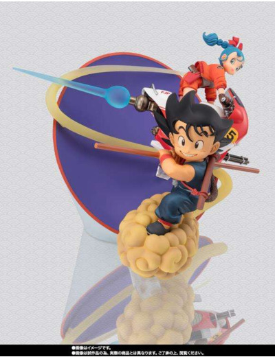 Comme illustré dans la première publication de "DRAGON BALL" dans le numéro 51 de "Weekly Shonen Jump" en 1984, Son Goku et Bulma sont amenés à FiguartsZERO ! Fabriquée en proportion de la taille du magazine à 180 mm, cette figurine ne se contente pas de recréer Son Goku et Bulma... Le fond circulaire unique de la couverture du magazine fait son chemin dans la figurine comme une scène. Les phares et le capot de la moto, ainsi que la queue nuageuse du Flying Nimbus et les pièces à effet de silencieux utilisent des pièces transparentes pour mieux représenter l'œuvre d'art originale. Tous les angles de Son Goku et même de la moto ont été matérialisés pour créer une recréation vraiment détaillée !