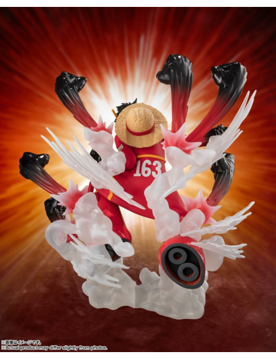 Figurine inspirée de l'arc Egghead mettant en scène "Monkey D. Luffy" utilisant la technique emblématique "Gum-Gum Hawk Gun (Hawk Gatling)". Ce modèle tridimensionnel capture chaque détail, avec des bras recouverts de Haki et des effets de fumée réalistes pour un rendu spectaculaire.