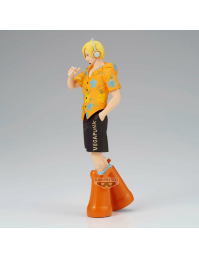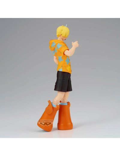 Figurine One Piece de Vinsmoke Sanji de la gamme The Shukko de Banpresto, représentant Sanji dans une pose élégante, vêtu de sa chemise à fleurs orange et de son pantalon noir. Mesurant environ 17 cm, cette pièce statique est fabriquée en PVC.
