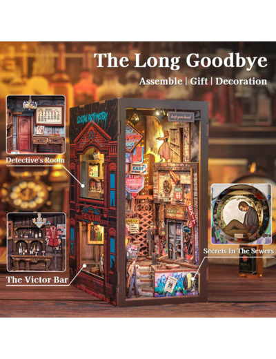 Plongez dans l'univers captivant du **kit DIY Book Nook - The Long Goodbye** qui évoque l'atmosphère fascinante et mystérieuse d'un roman noir. Avec **238 pièces en contreplaqué** soigneusement découpées, ce kit vous invite à vivre une expérience créative immersive, parfaite pour tous les passionnés de **loisirs manuels**, de maquettes et de décors miniatures.