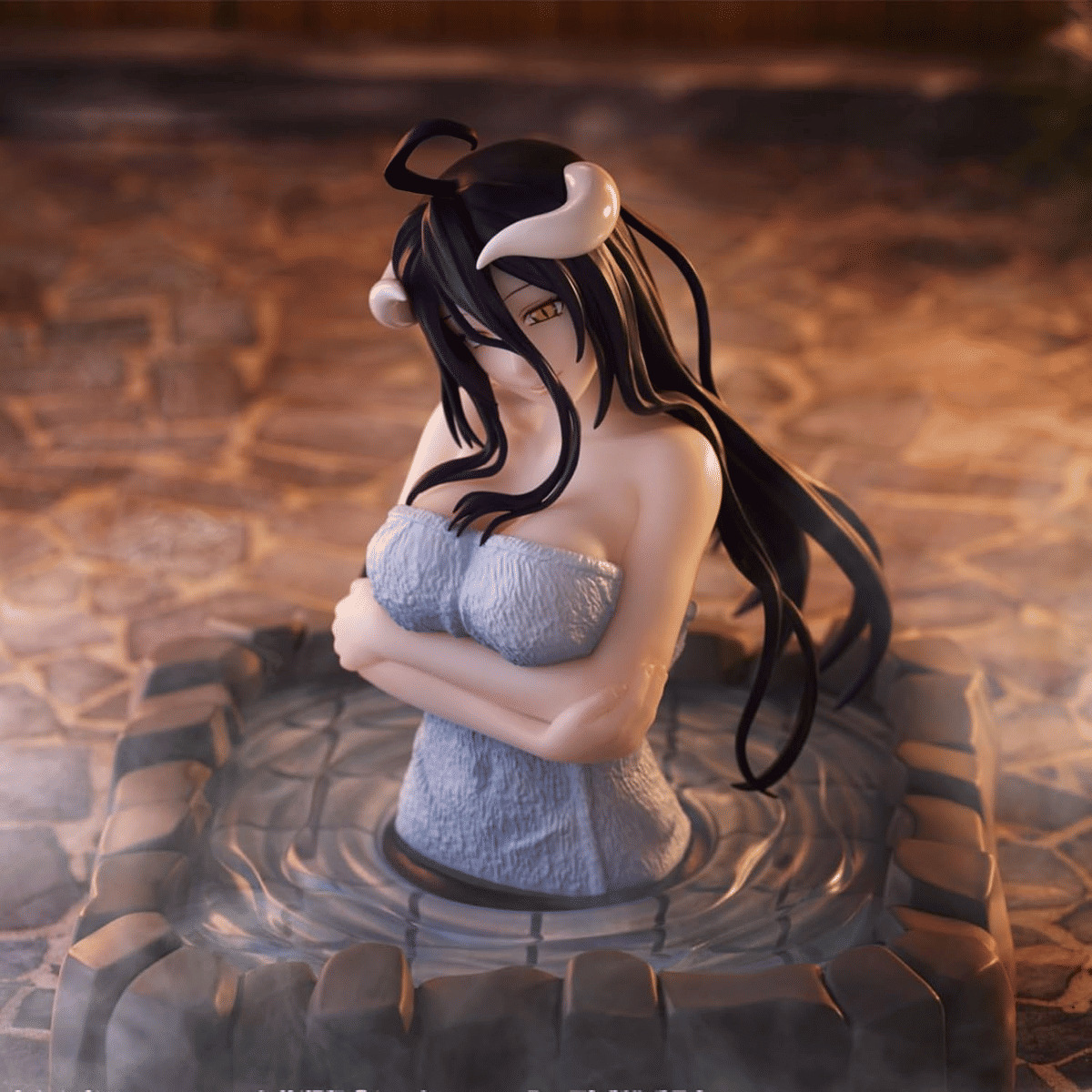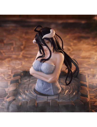 Vêtue d'une serviette, seul son buste apparaît hors de l'eau dans laquelle elle se baigne.