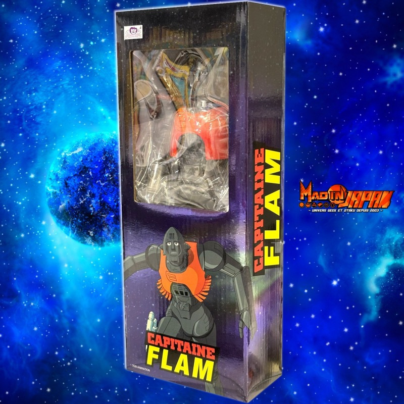 Cette figurine de Crag HL PRO Metallic version mesure 25 cm de hauteur et elle vous sera livrée dans une boite fenêtre, fabriquée aux couleurs de la licence Capitaine Flam avec le logo français.