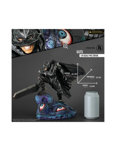 Fabriquée en PVC, cette figurine de Guts mesure 26,6 cm de hauteur par 21,8 cm de largeur pour 37,5 cm de profondeur.