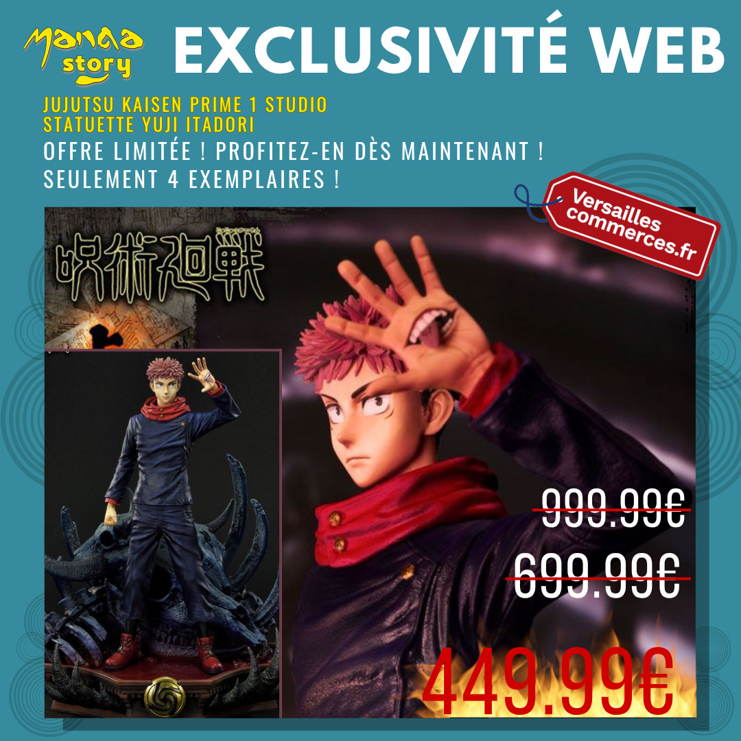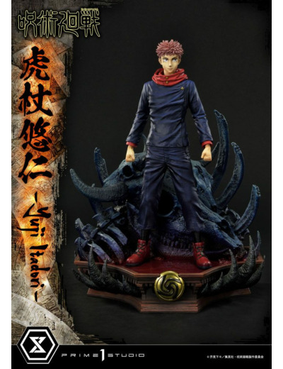Découvrez l'étonnante statue de Yuji Itadori de la série Jujutsu Kaisen, créée par Prime 1 Studio. Cette pièce détaillée capture l'essence du personnage avec une hauteur d'environ 38 cm, présentée sur une base décorative avec des détails sombres qui évoquent une atmosphère mystique. La figurine est méticuleusement peinte à la main, mettant en valeur le costume bleu foncé de Yuji, complété par son écharpe rouge caractéristique et ses boutons dorés emblématiques.