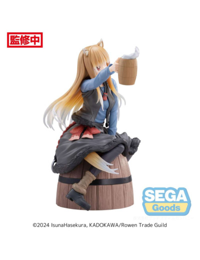 La figurine Holo Luminasta de Spice and Wolf mesure environ 15 cm de hauteur. Elle représente Holo assise sur un tonneau, une bière à la main.