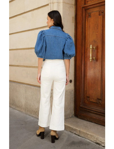 Le jean Victorine est un jean coupe wide, c'est à dire que c'est une coupe qui est cintrée au niveau de la taille puis qui s'évase des hanches jusqu'aux chevilles. C'est une coupe qui flatte la majorité des morphologies.