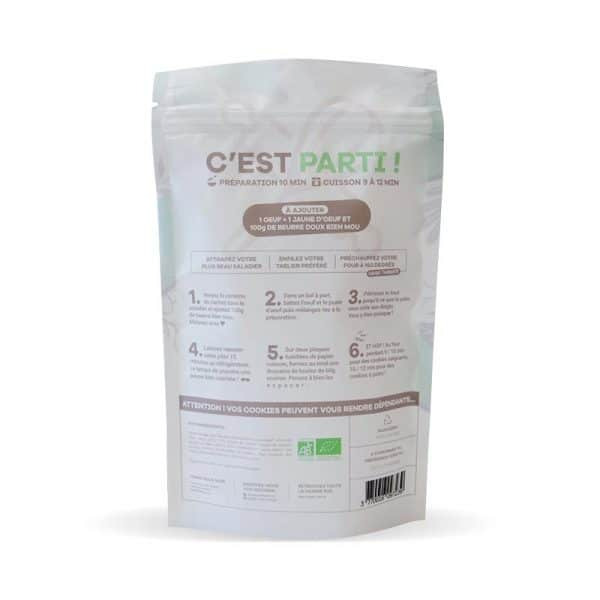 Composition : Ingrédients kit préparation bio cookies chocolat blancFarine de blé* des Moulins de Brasseuil, cassonade*, chocolat blanc (min. 32%)* 12% (sucre de canne*, beurre de cacao*, poudre de lait entier*), sucre mascobado*, sucre blanc*, sel, poudre à lever, bicarbonate de sodium. Peut contenir des traces éventuelles de soja et de fruits à coque. *Ingrédients certifiés agriculture biologique.ConservationDDM 9 mois minimum. Nous vous recommandons de conserver vos kits préparation à température ambiante.La petite astuce !Répartissez vos pâtons sur deux plaques de cuissons pour laisser la pâte s’exprimer librement !