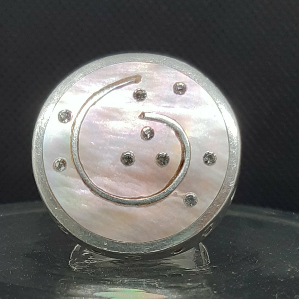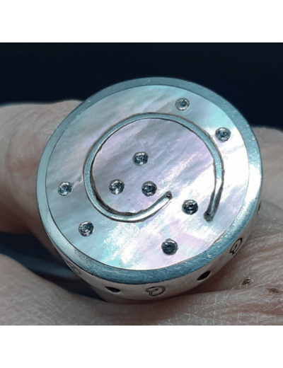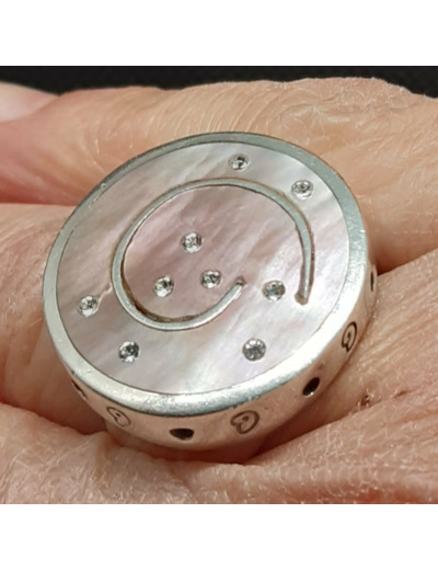 Très belle bague en ARGENT (poinçonnée) présentant un disque en nacre abalone ( ormeau en français) , offrant un nuancier de couleurs irisées.