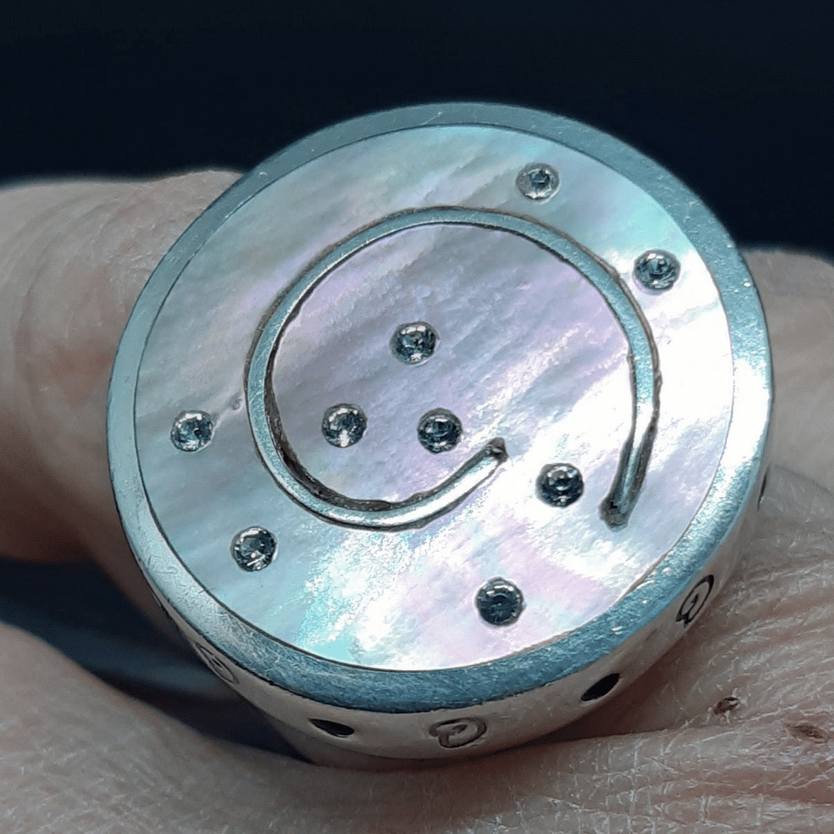 Il est orné d'un motif sur le dessus, et porté par une monture gravée sur sa circonférence