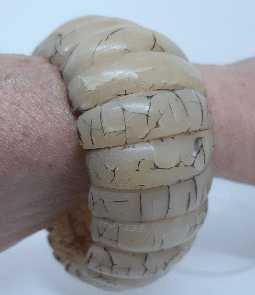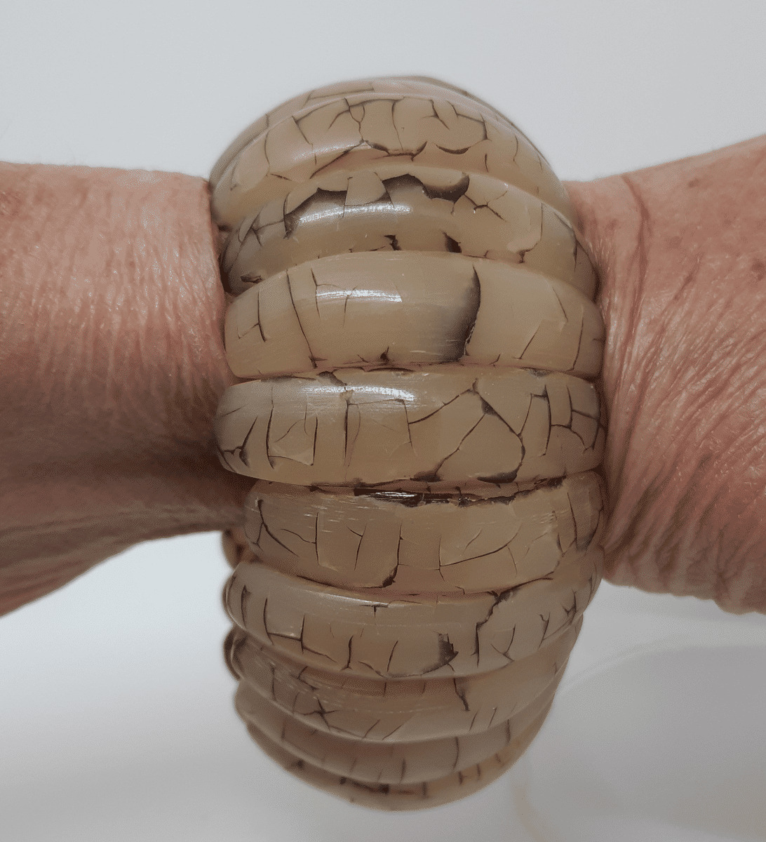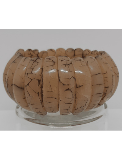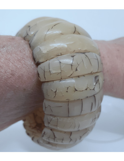 Grand bracelet monté sur élastique, formé d'éléments en résine comportant des inclusions, donnant un aspect marbré à l'ensemble