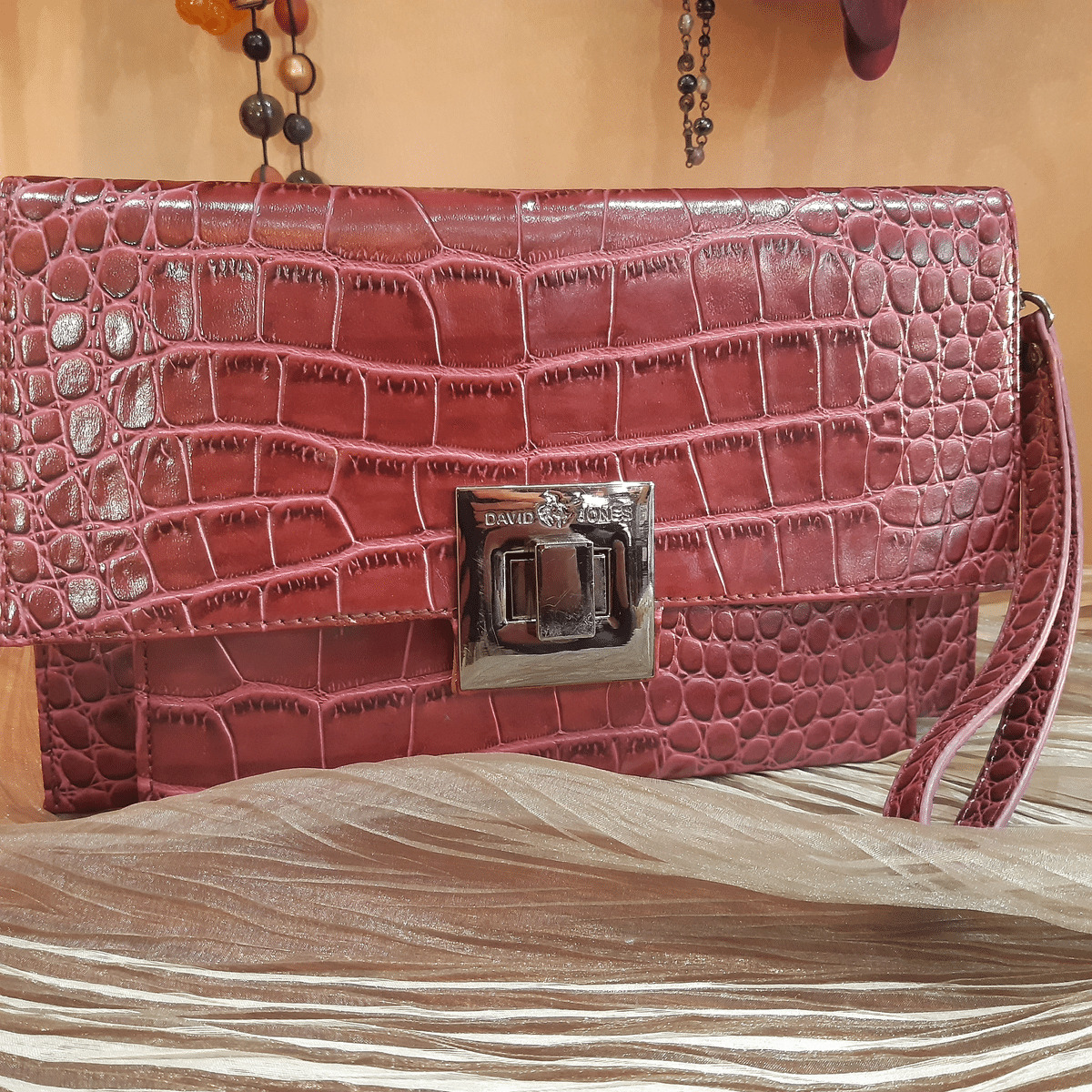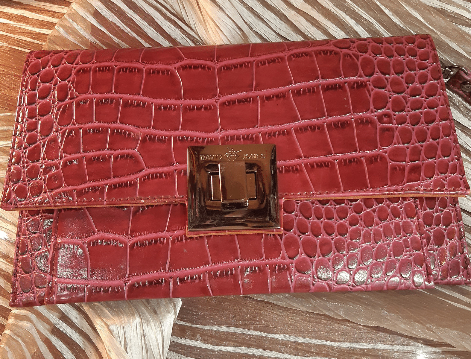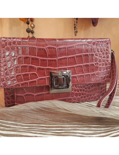Pochette de marque David Jones en cuir synthétique , couleur framboise2 soufflets intérieurs, doublés de tissu fleuri