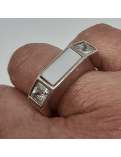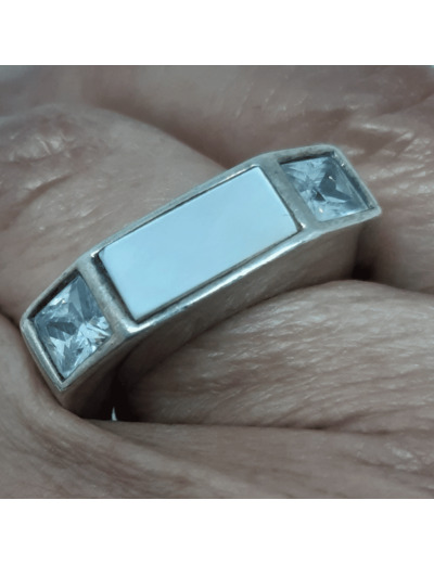 Bague en ARGENT (poinçon), de style Art Déco, présentant une barrette rectangulaire en nacre entouré de jolis strass