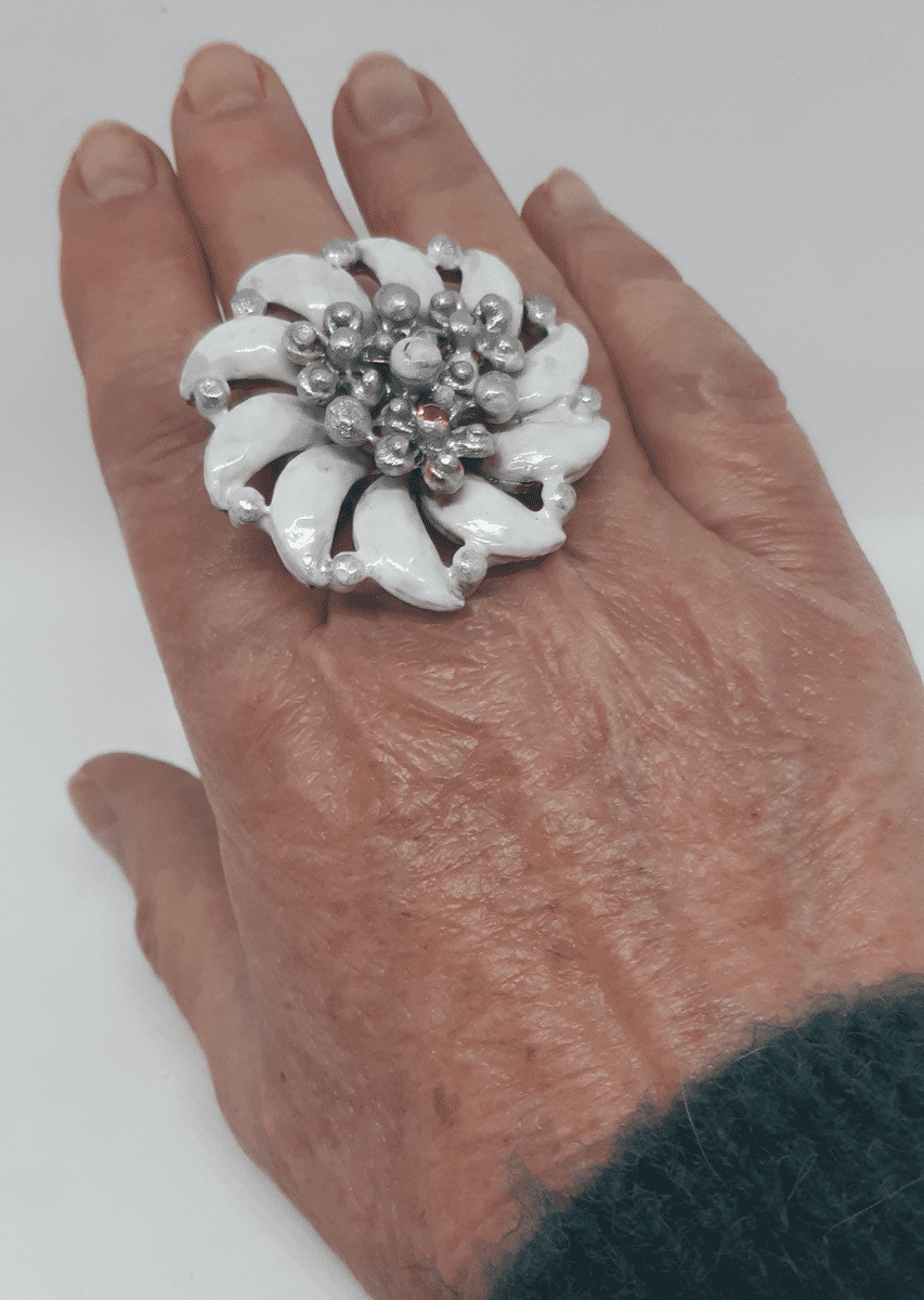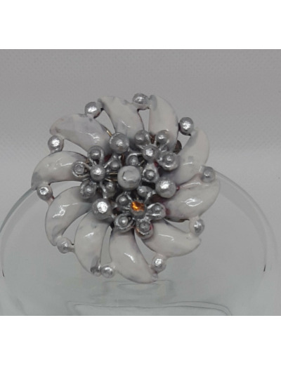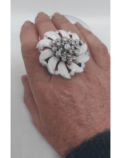 Bague vintage de scène représentant une grande fleur en métal émaillé de couleur blanche