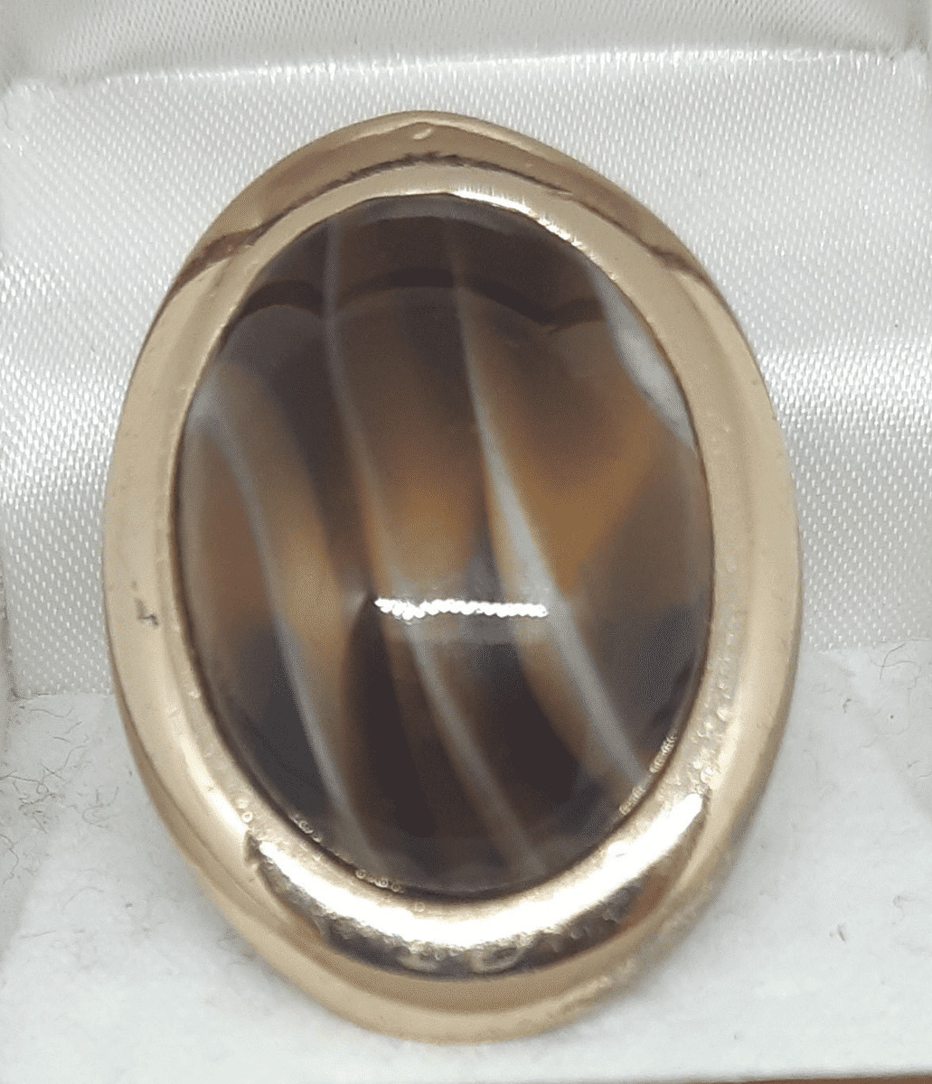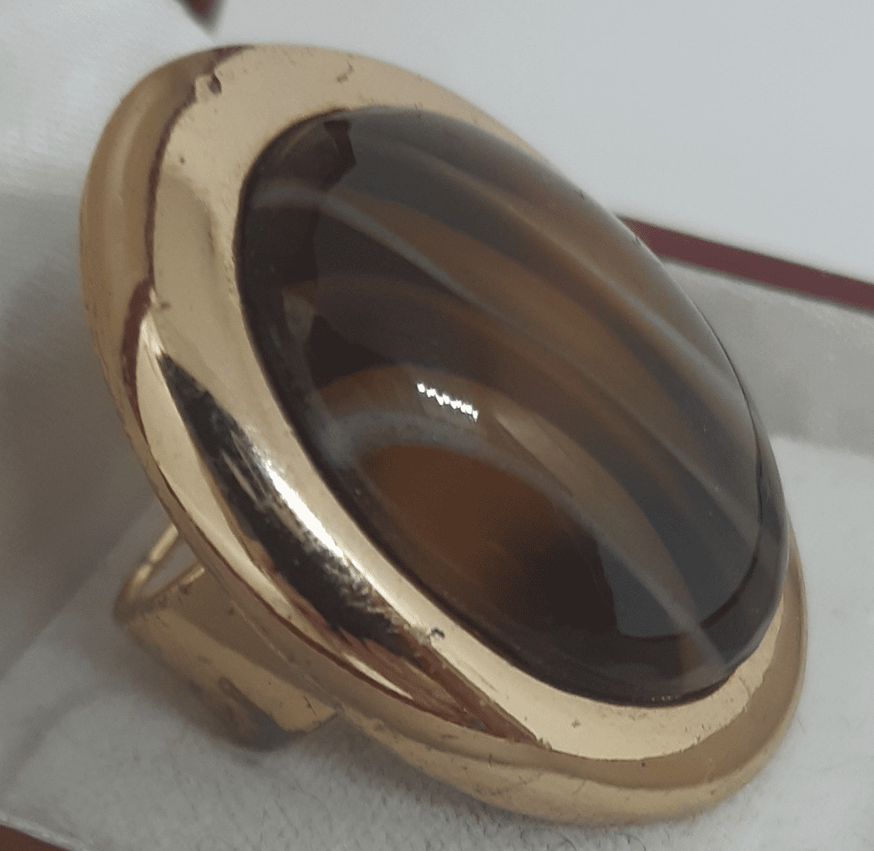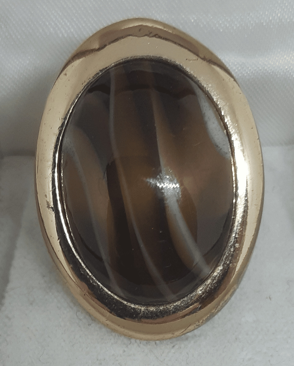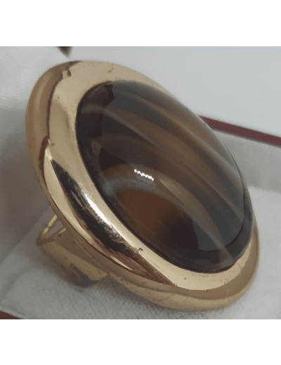 Grande bague vintage de marque LANVIN ornée d'un gros cabochon ovale en pâte de verre imitant l'oeil de tigre, cerné d'une monture dorée