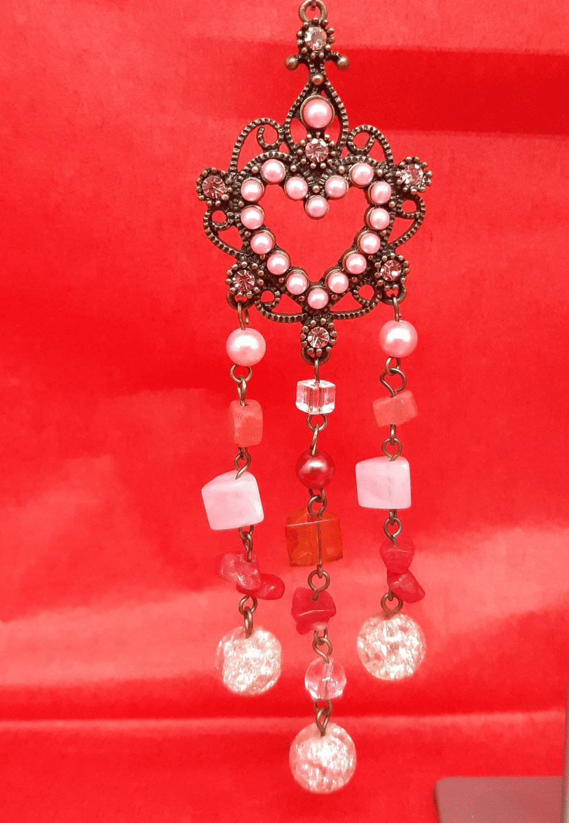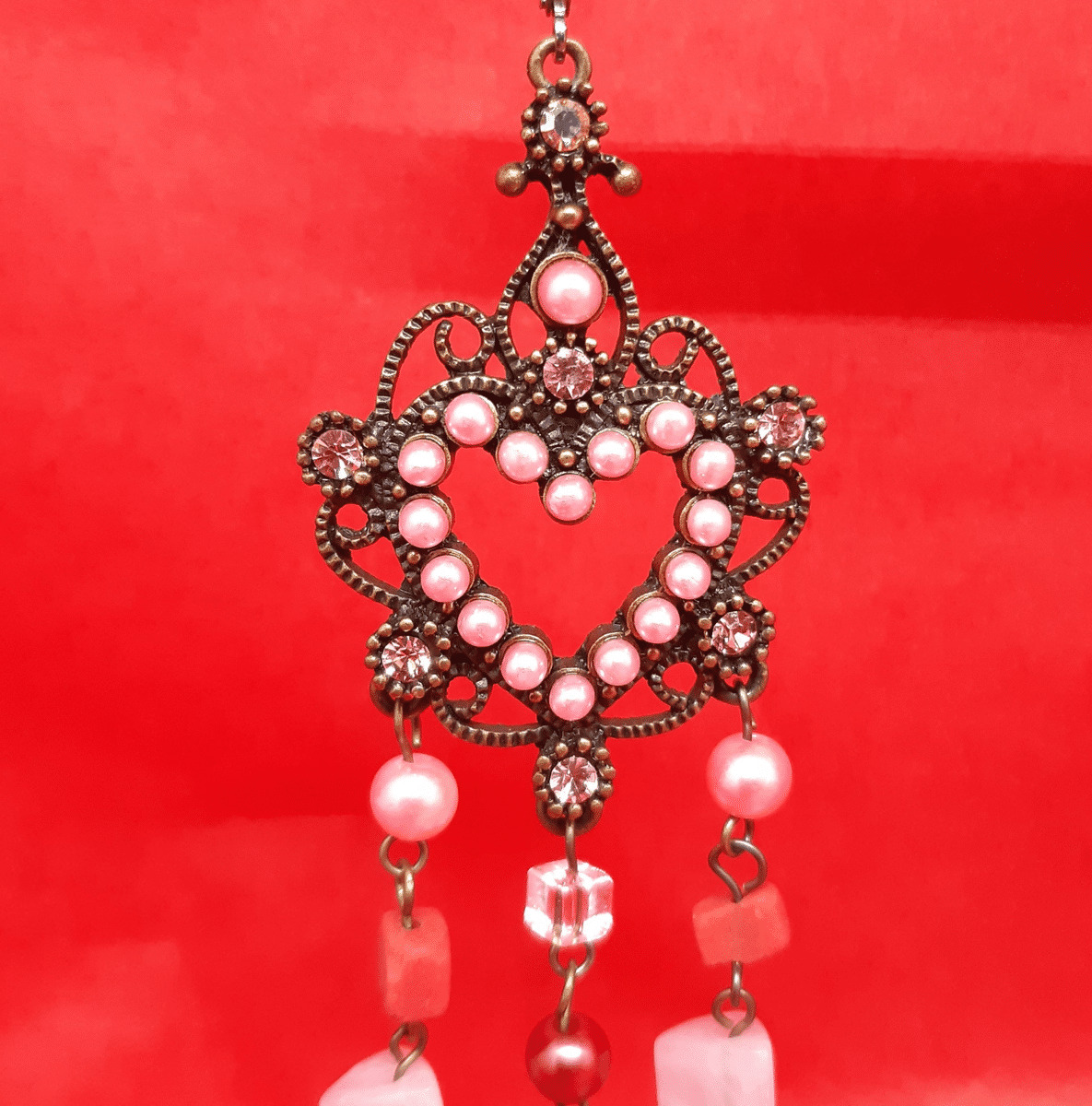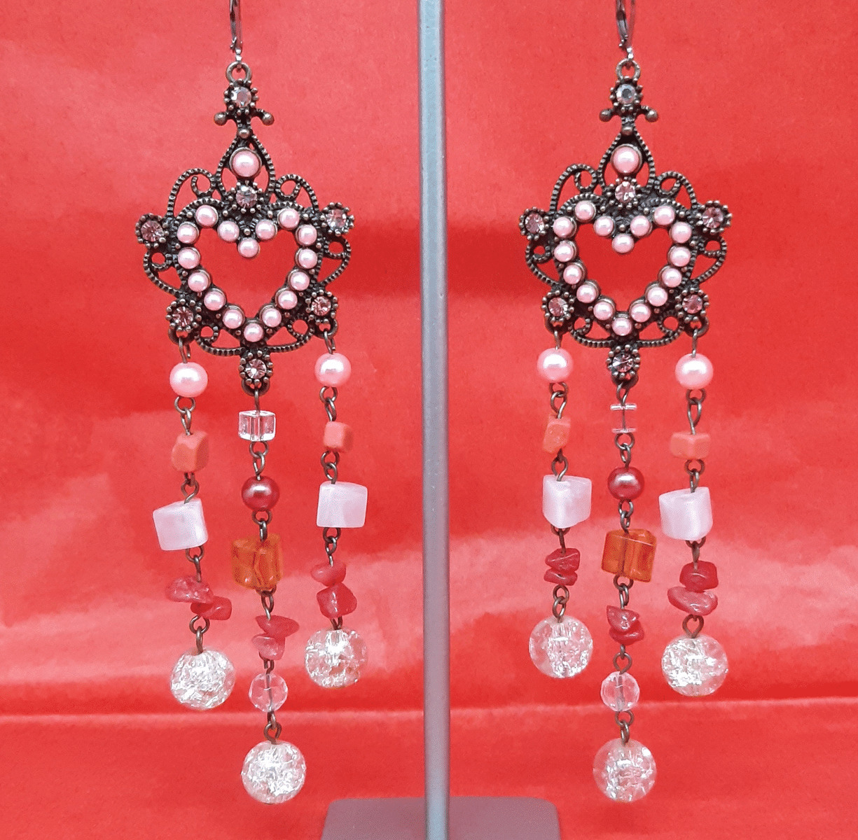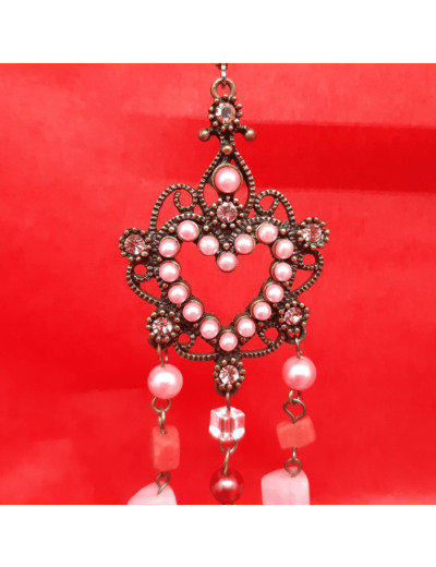 Longue paire de boucles d'oreilles formant coeur en perles rosées d'où pendants des chainettes en perles rondes et carrées