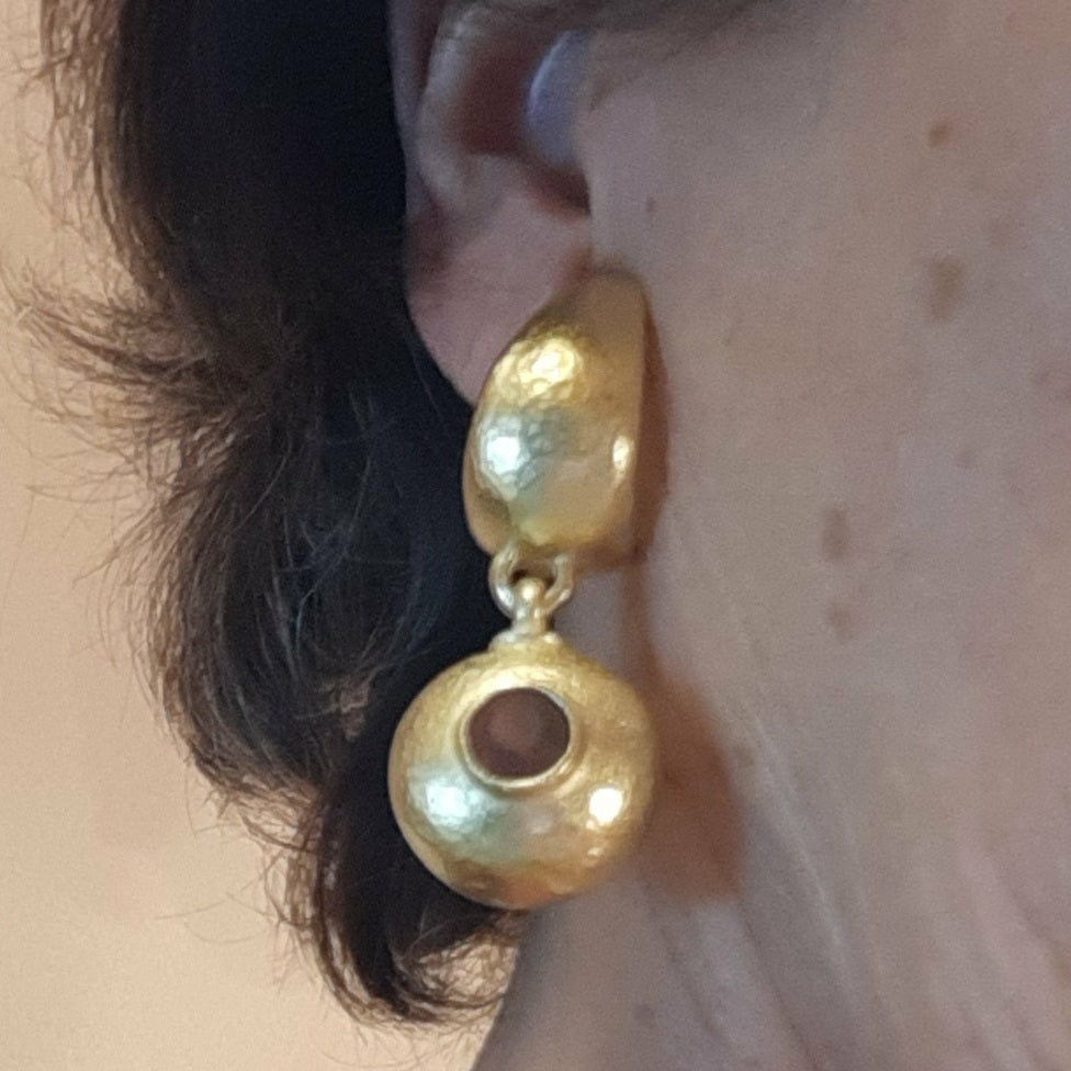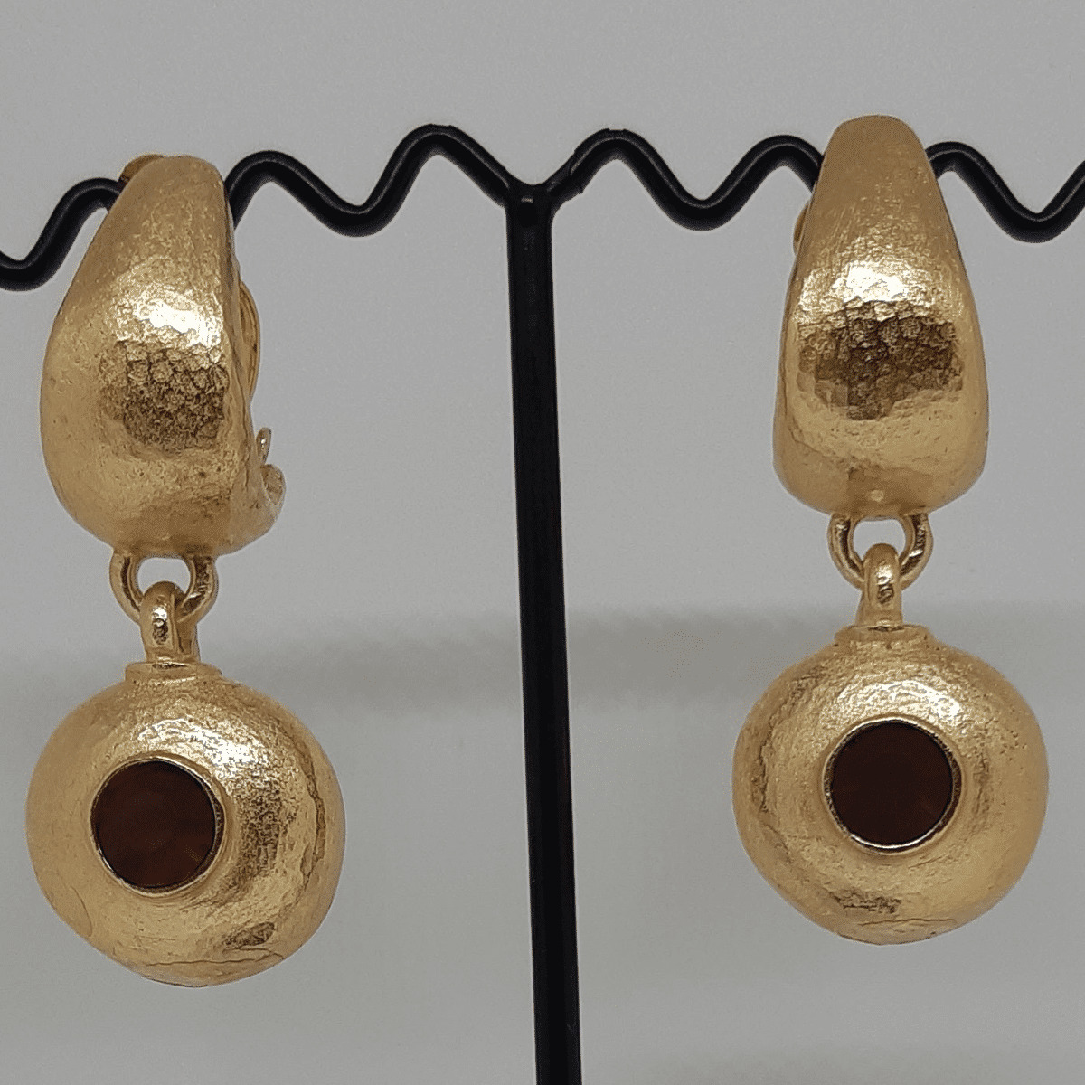 Formé d'une créole large d''où pend un médaillon avec en son centre un cristal taillé de couleur orangé