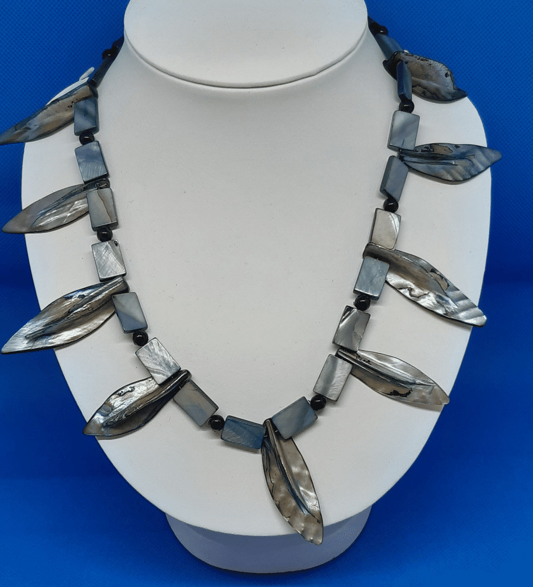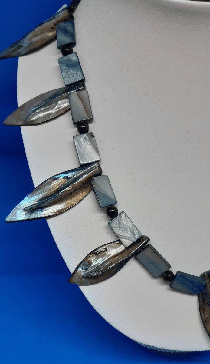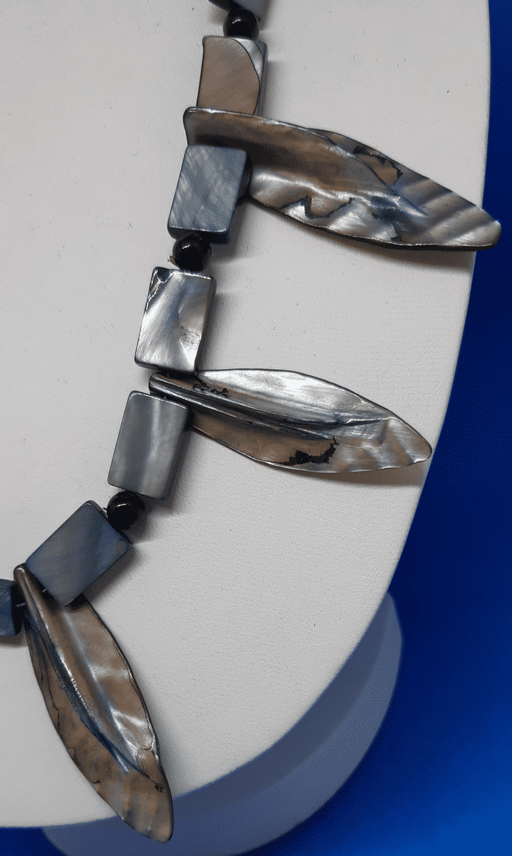 Intéressant collier ras du cou en nacre arborant un décor de feuilles , à la manière de trophées