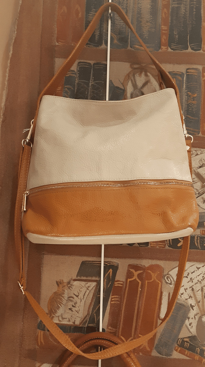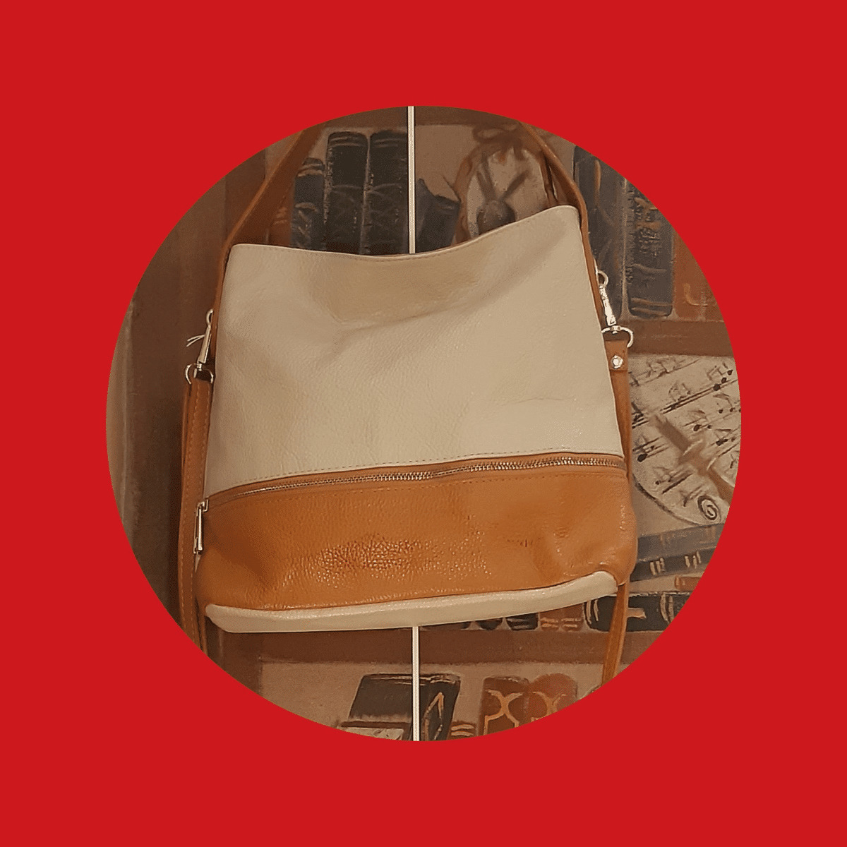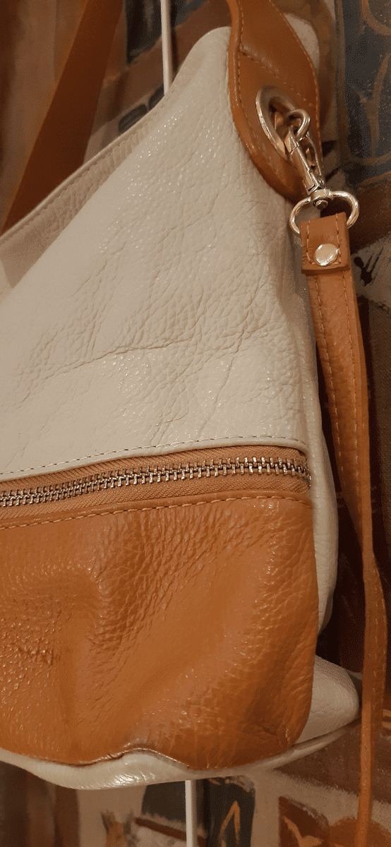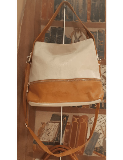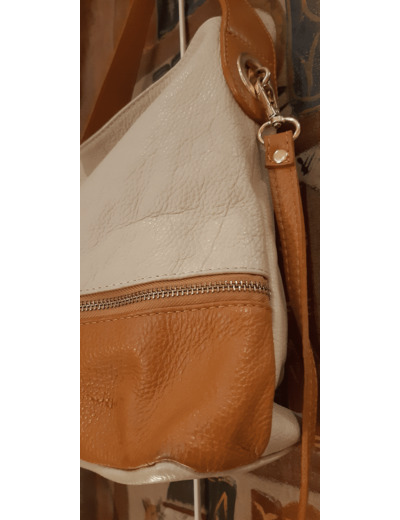 Sac en cuir bicolore, légèrement grumeleux, beige et havane