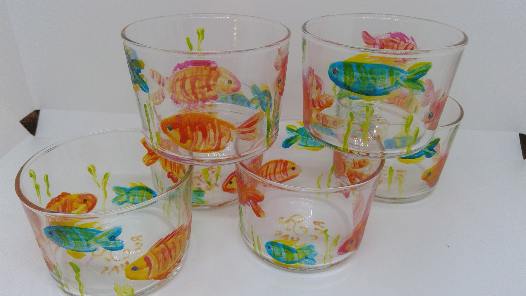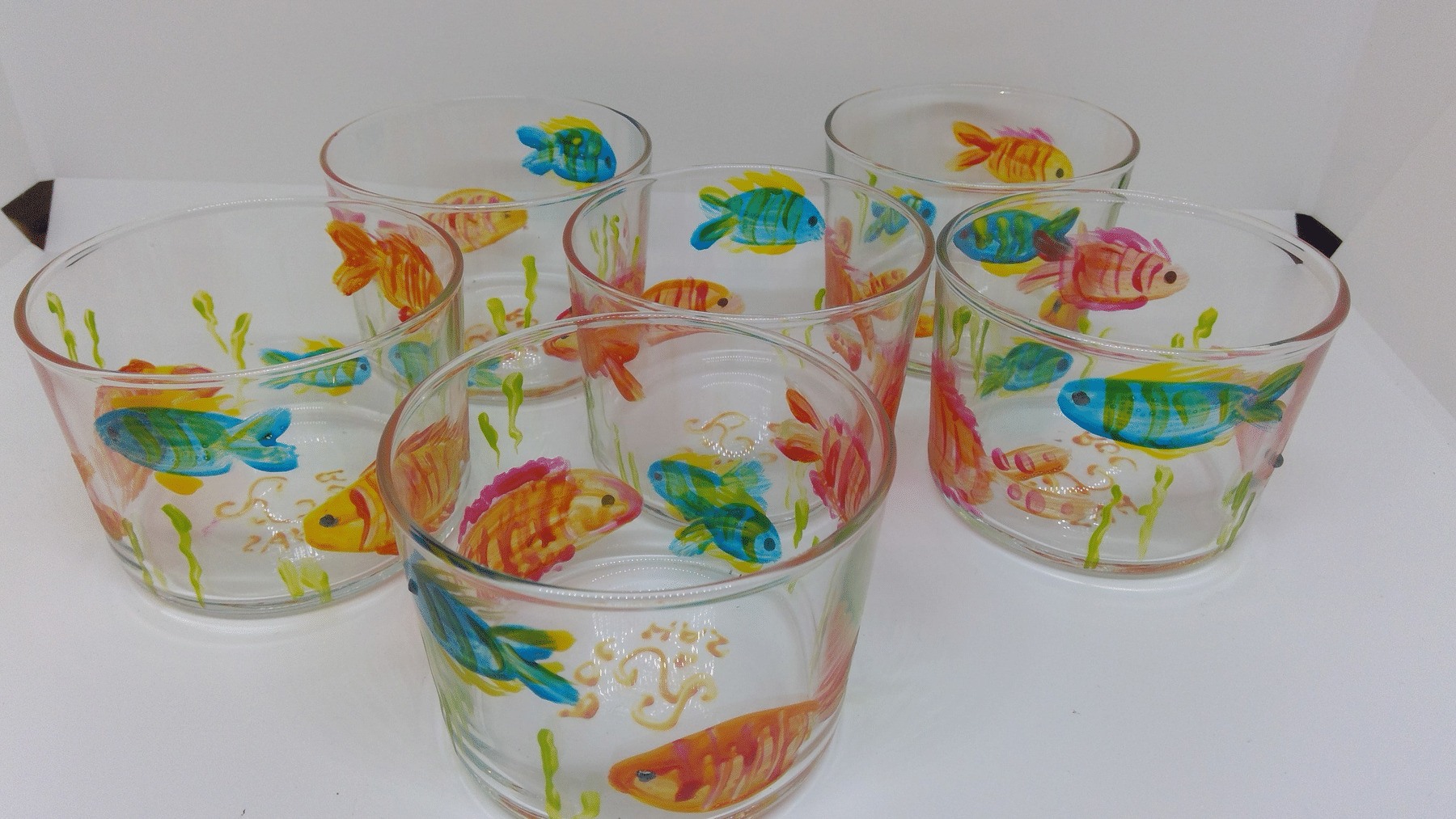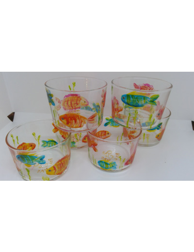 Série de 6 verres à bodega peints main aux motifs de petits poissons.