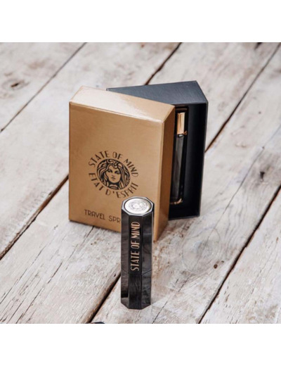 Il faut dire que le flacon 20ml laqué noir du parfum d’exception de la maison STATE OF MIND est octogonal. Il s’ouvre à la manière d’un rouge à lèvres. Son design ART DECO est sublimé par le logo de la maison, présent sur le capot.
