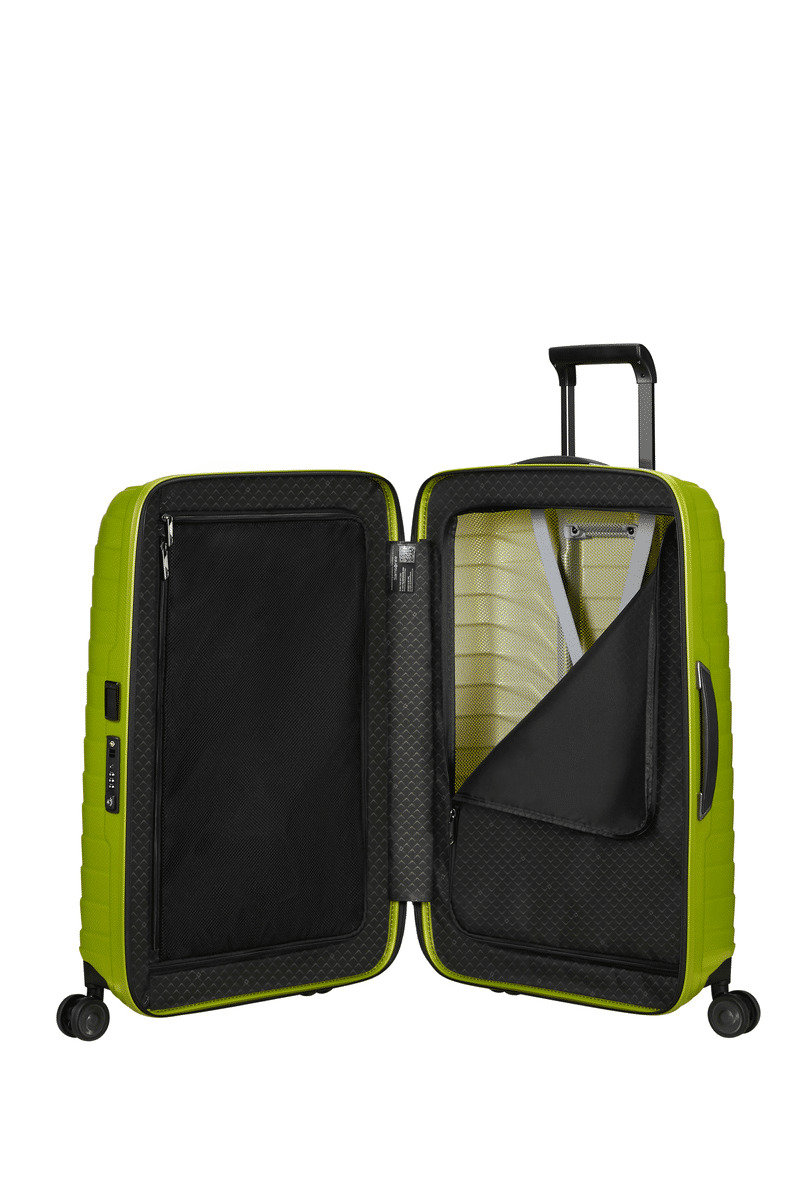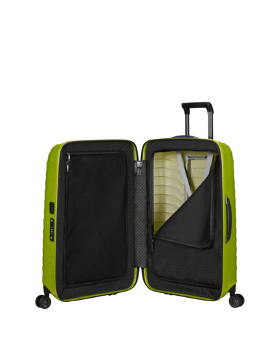 Caractéristiques : Ce modèle est équipé de quatre roues à suspension pour une maniabilité fluide, d'une serrure TSA intégrée pour une sécurité accrue, et de poignées supérieures et latérales pour une manipulation facile. L'intérieur est fabriqué à partir de PET recyclé, respectueux de l'environnement. Idéal pour les voyages de moyenne durée, avec une grande capacité de rangement et une conception durable.