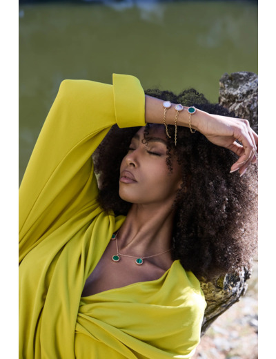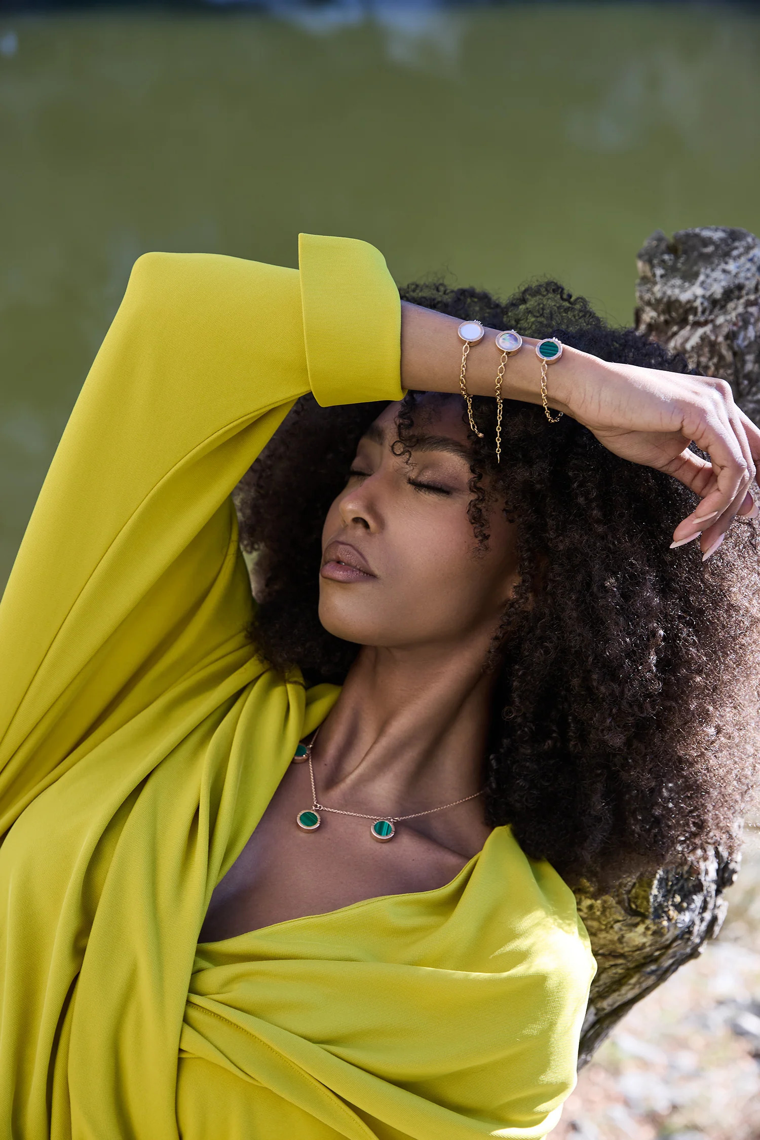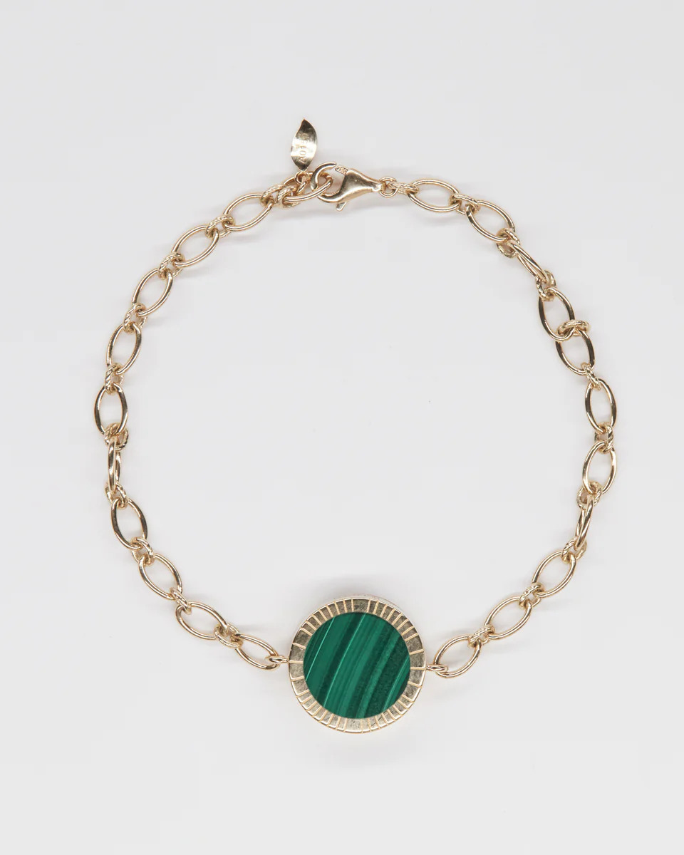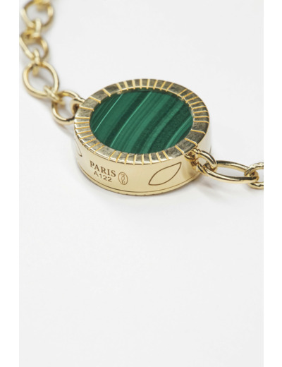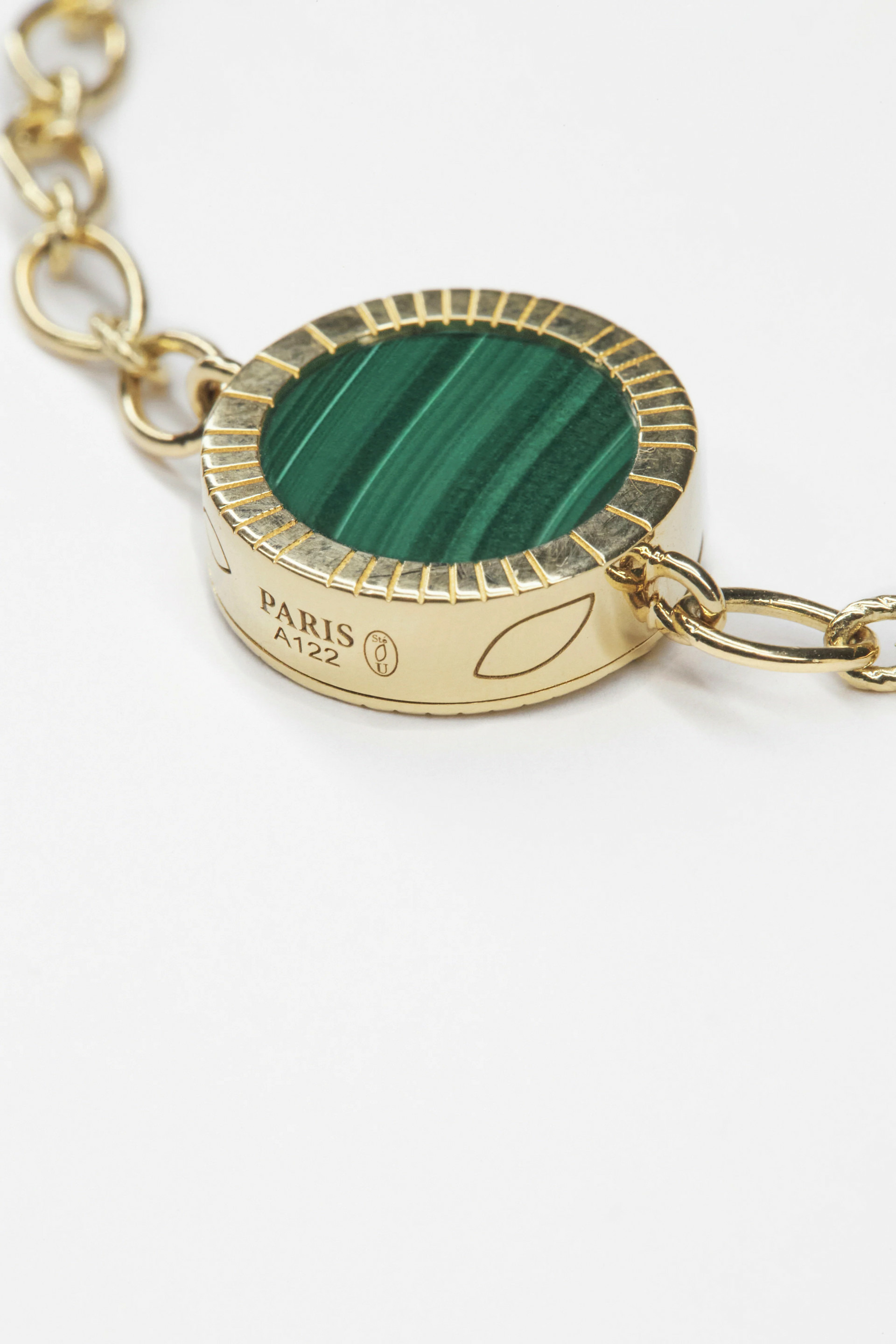 La composition du bijoux allie un Malachite vert et une chaîne en or jaune 18 carats de 18 cm avec une maille ovale.