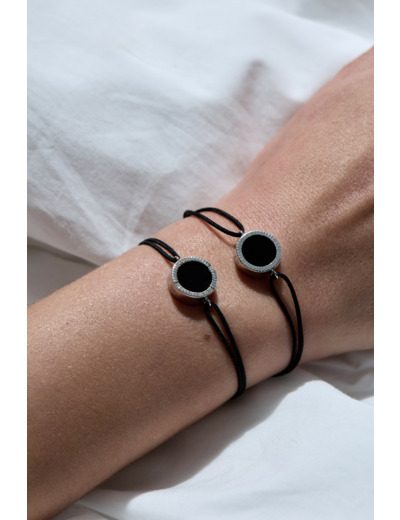 La composition du bijoux allie une Agathe noire et un anneau en Or blanc 18K. Le cordon est noir.